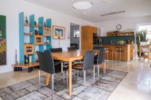 The house focuses on sustainability and has environmentally friendly solutions such as a heat pump and solar panels, which ensure low operating costs and a reduced environmental impact. In addition, a charging station for electric cars has already been installed to promote environmentally friendly transportation options.