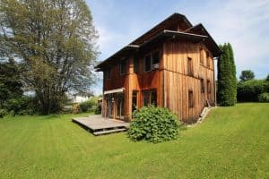 Sunny and quietly situated residential house in the timber frame construction with larch boarding in Velden on the beautiful Wörthersee; approx. 140 square meters of pure living space plus approx. 30 square meters of terrace area; the residential house was built on an approx. 2655 square meters large property which is mainly located south of the residential building; a total of 7 rooms are available here - whereby there are 2 master bedrooms and 2 smaller children's rooms; one of the smaller rooms has a staircase to the attic which can be used as a gallery (currently separate living area) and has a beautiful balcony; the main room of the